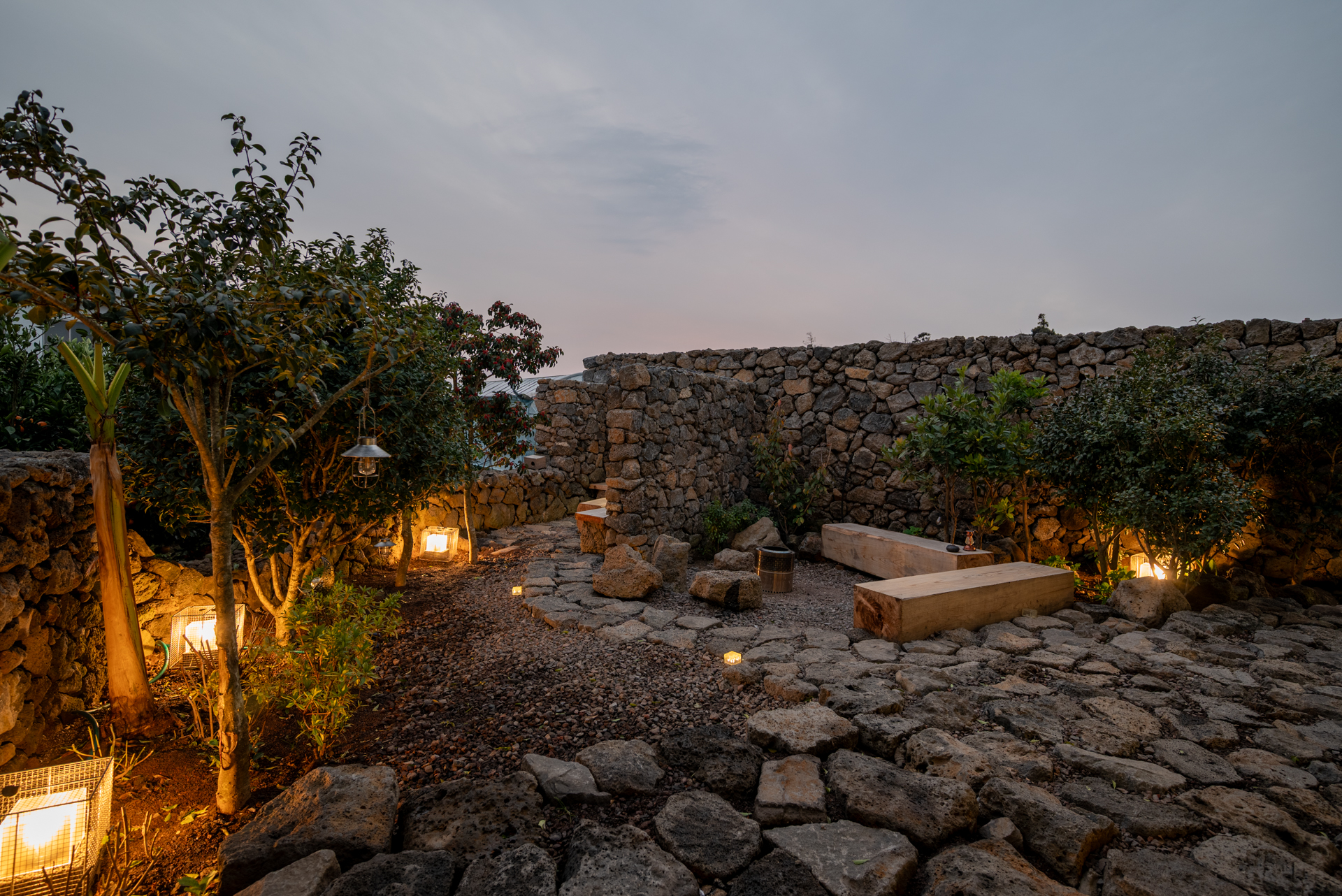 정원에는 커다란 돌에서 흘러 나오는 온수로 발을 담글 수 있는 족욕탕이 있어 사계절 언제라도 편한 휴식을 취할 수 있습니다.